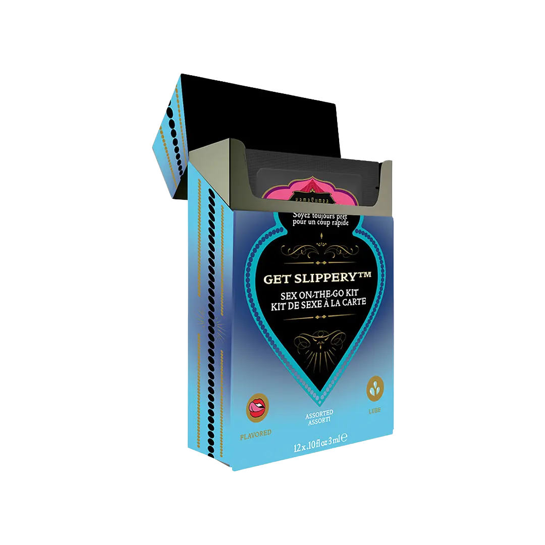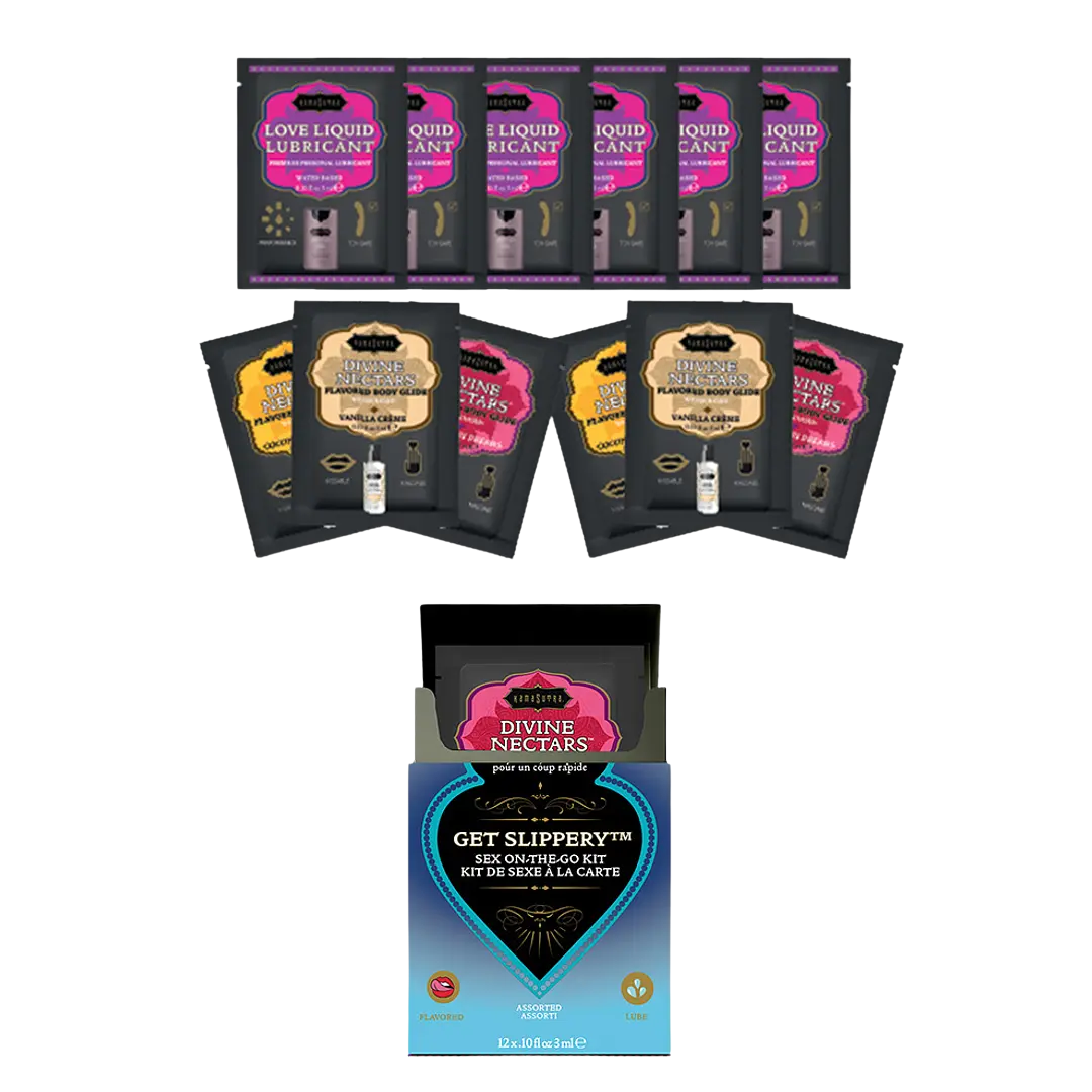 Descripción: Set de 12 sachets Kama Sutra: 6 de Néctar Divino (lubricante saborizado) y 6 de Amor Líquido (neutro). Textura sedosa, base de agua. Ideal para encuentros espontáneos.